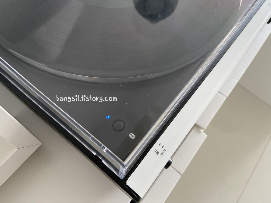 이라고 생각하시면 돼요. 제가 산 모델은 AT-LP60XBT 로 블루투스 스피커와 연결할 수 있는 모델이에요. 한 번 페어링 해두면, 다시 손쉽게 연결 가능해서 블루투스 스피커만 쓰신다면, 매우 편리하게 사용 가능해요. 2~3초 버튼을 누르면 빨간색과 번갈아가면서 점멸하고 잘 연결되면 아래와 같이 파란불이 들어옵니다.