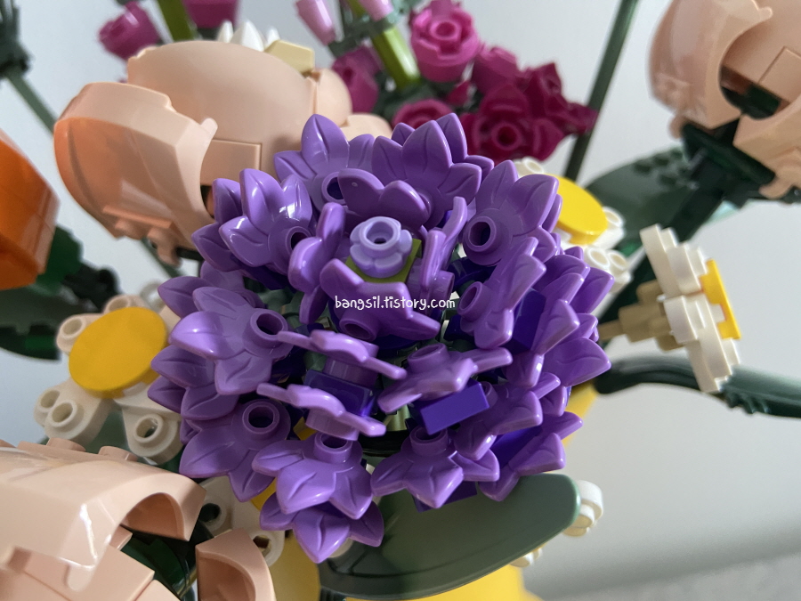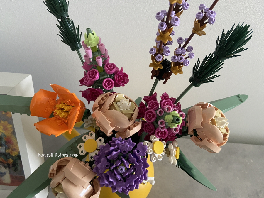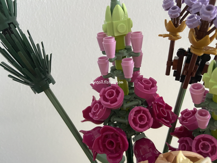 그리고 완성하고 나니까 중요한 게 잎사귀도 넣은 게 참 좋았어요. 꽃다발에 꽃만 덩그러니 있으면 뭔가 조화롭지 않은 느낌이잖아요? 그런데, 이번 레고는 그런 것도 잘 고려해서 만들었다는 느낌이 들었어요.