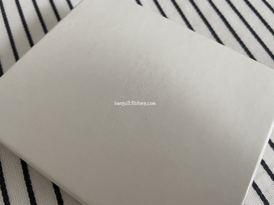 카드지갑은 메종 마르지엘라 상자에 담아져 왔고, 메종 마르지엘라 액세서리 제품인 11자에 동그라미가 쳐져 있네요. 직구 제품의 경우 케이스의 상태가 좋지 않은 경우가 있어요.