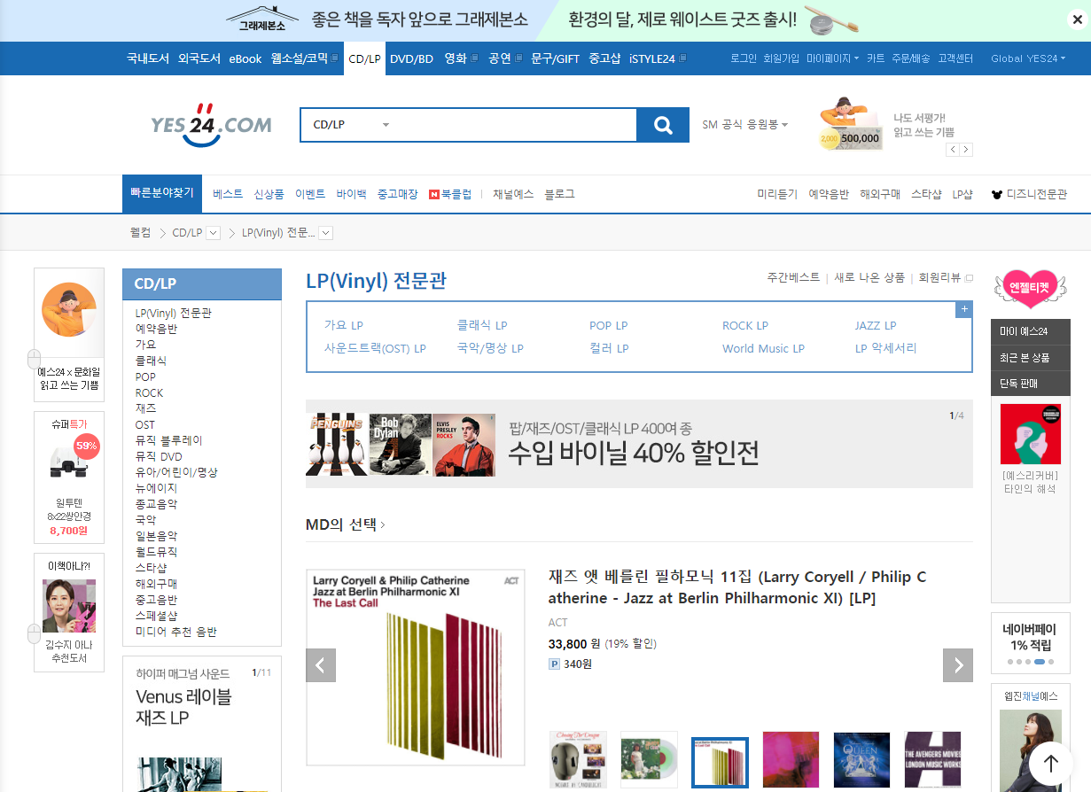 그리고, 가장 편하게 구입할 수 있는 곳. Yes24. Yes24에도 바이닐 섹션이 따로 마련되어 있어서 살펴보기 좋을 거 같아요 :) 저도 탐나는 LP들이 많더라고요.