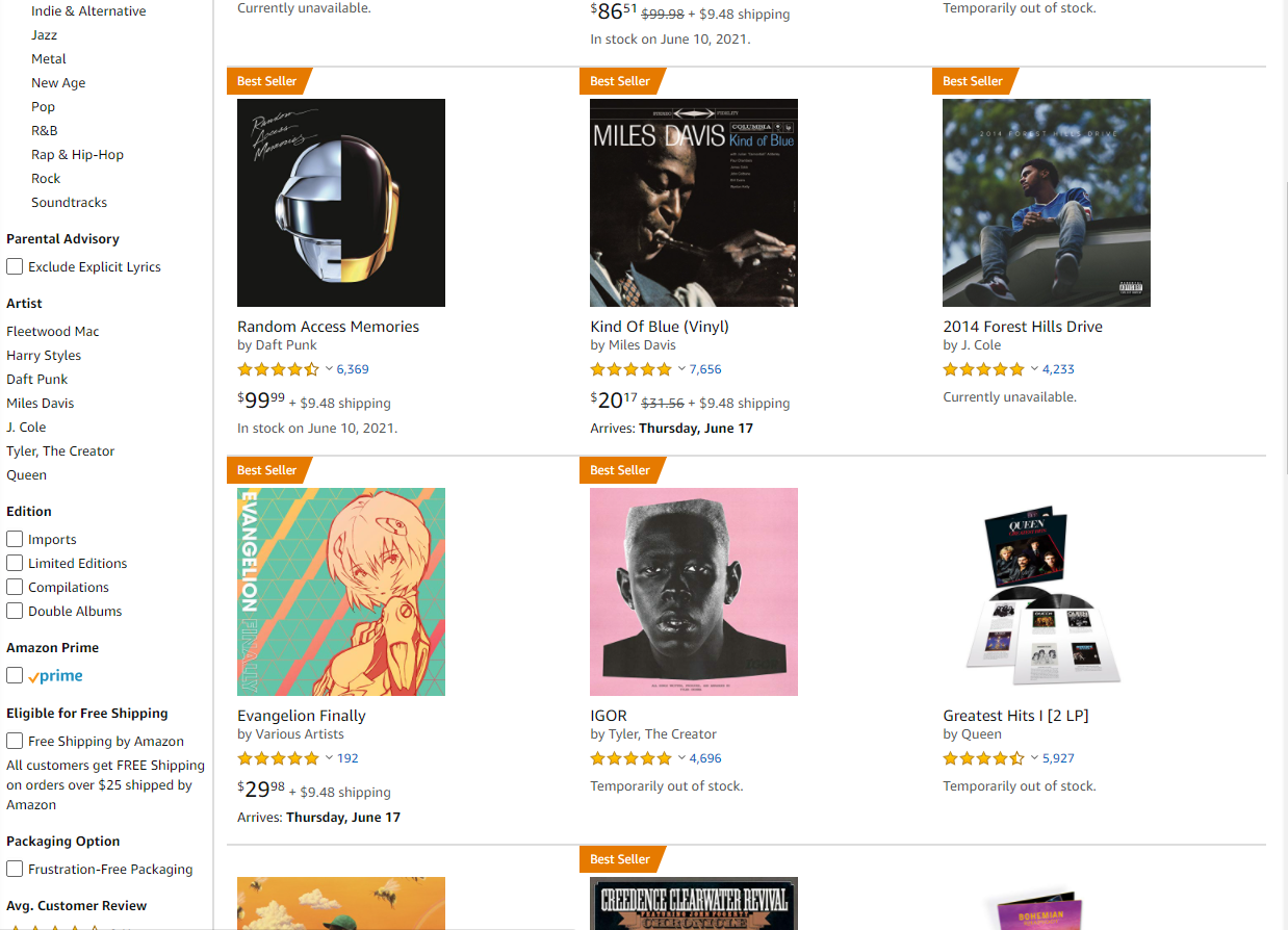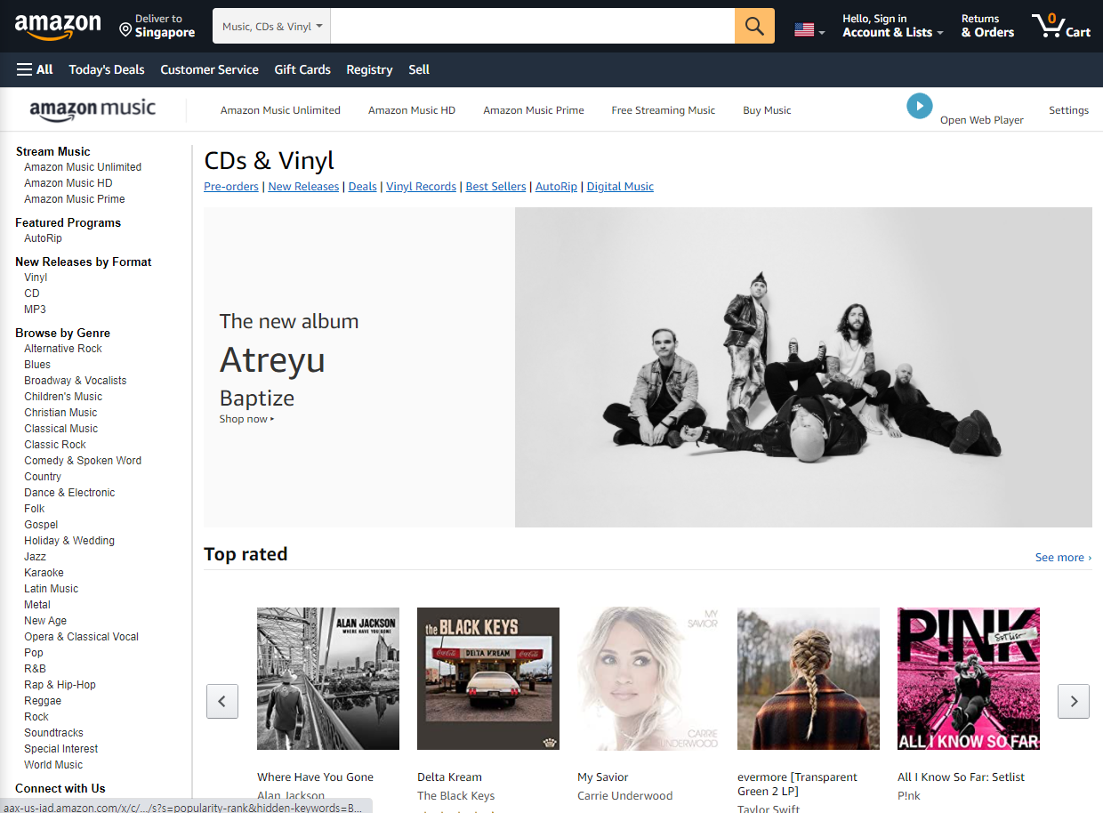 제가 가장 많이 구매하는 곳은 아마존입니다. 아마존 미국에서 구매를 주로 하는 편이고요. 우선 종류가 정말 많아요. 아마존의 CDs & Vinyl 섹션에 가면 현재 인기 있는 음반들을 포함해서 신간 앨범 등을 자유롭게 볼 수 있어요.