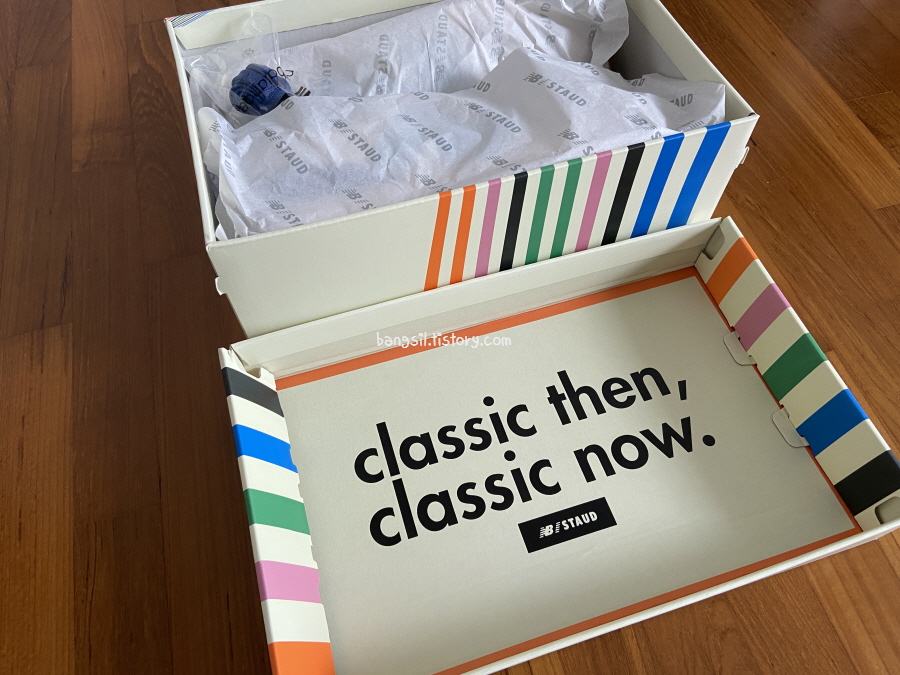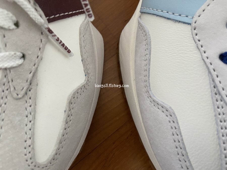 버건디는 작년 가을에 나왔었는데요. 그래서 그런지 가을, 겨울 느낌이 강한 신발이었어요. 가죽도 좀 더 두껍고 스웨이드 부분 색깔도 약간 짙은데, 이번 블루는 여름을 겨냥해서 나온 신발이라서 그런지 가죽도 좀 더 얇고 부드러운 가죽이고 스웨이드도 좀 더 밝은 느낌이었어요.