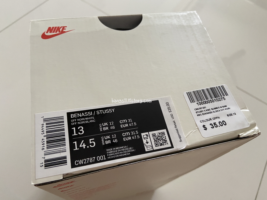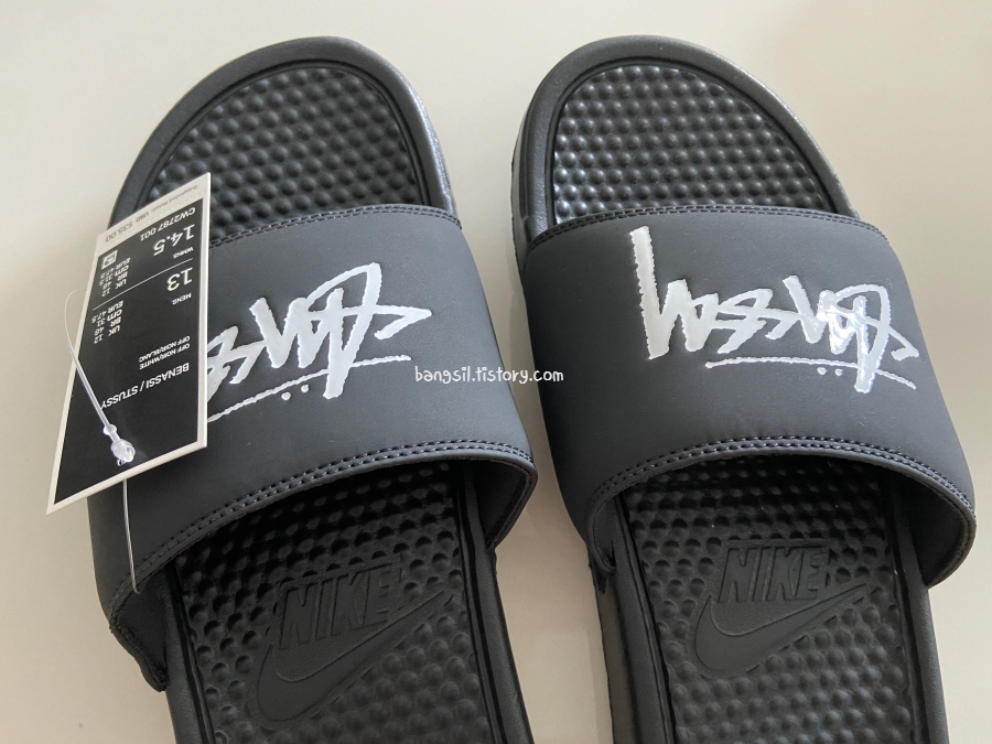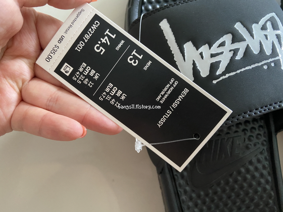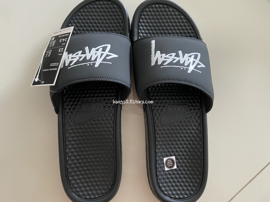 제가 구입한 슬리퍼는 정확한 이름은 Stüssy x Nike Benassi Slide (Off Noir) 이고요. 코드는 아마도 CW2787-001 인 것 같고, 사이즈는 US13으로 구입했어요.