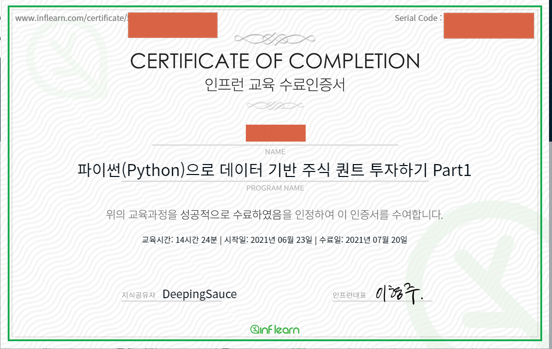 이 강의명은 "파이썬(Python)으로 데이터 기반 주식 퀀트 투자하기 Part1"인데, "인프런(Inflearn)"이라는 한국 사이트에 올라와 있다. 강사님은 "DeepingSauce"님이시다.