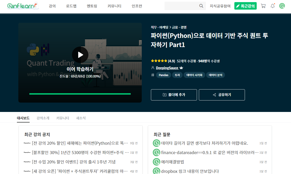 요즘 나의 최애 수업!! 인프런의 파이썬으로 데이터 기반 주식 퀀트 투자하기 수업이다. 인프런은 여러 가지 수업이 있는데 거기서 내가 듣고 싶은 수업을 찾아서 결제해서 듣는 플랫폼이다.