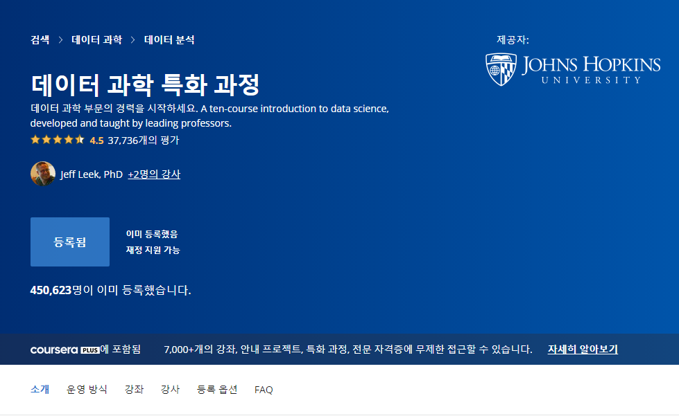 마음잡고 들었었던 코세라의 존스 홉킨스 대학 수업 데이터 사이언스 특화 과정. (오랜만에 들어갔더니 다 한국말로 나와서 좀 헷갈린다)