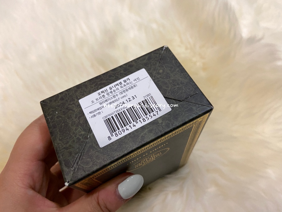 패키지의 아래는 이렇게 사용기한이 적혀 있고요. 근데 사실 오픈하면 최대한 빨리 (거의 6개월 안에) 사용하는 게 좋다고 들었어요. 박스를 오픈해보면 뚜껑에 이렇게 씰이 붙어져 있어요. 꼭 확인하시고요.