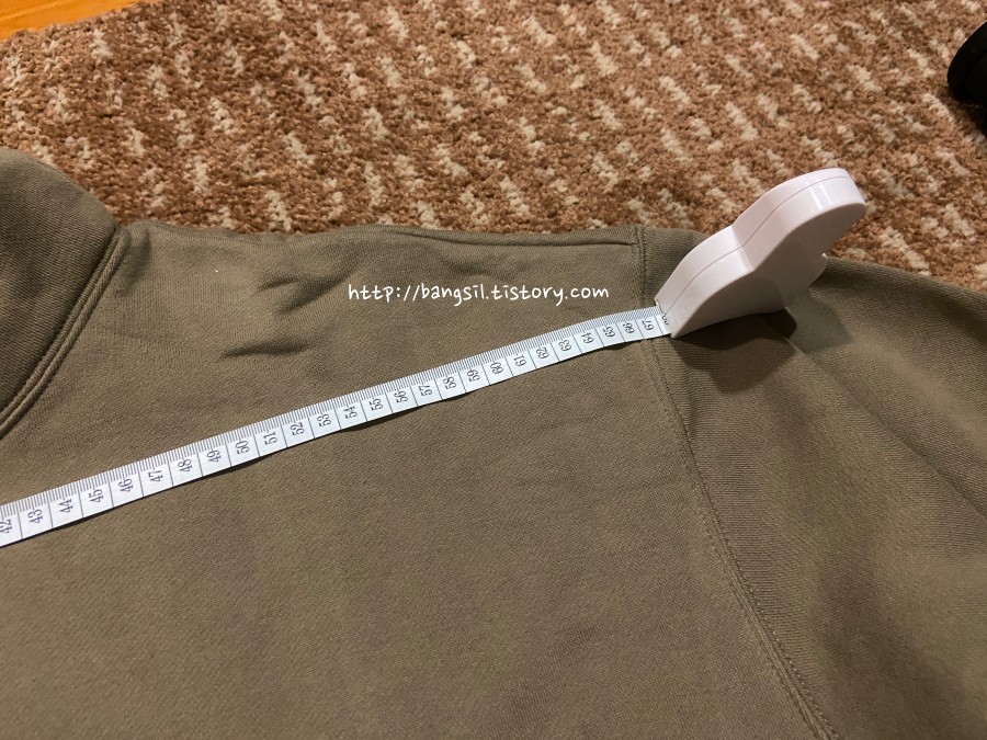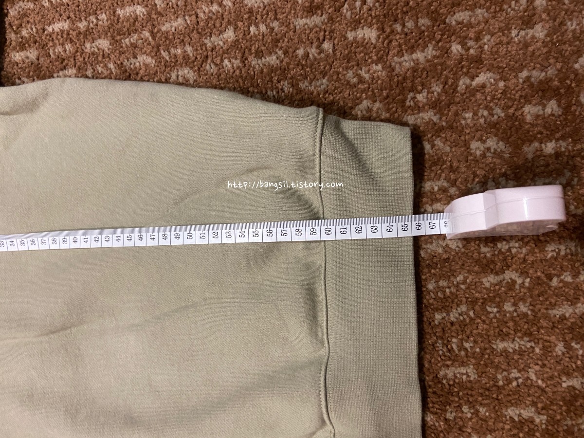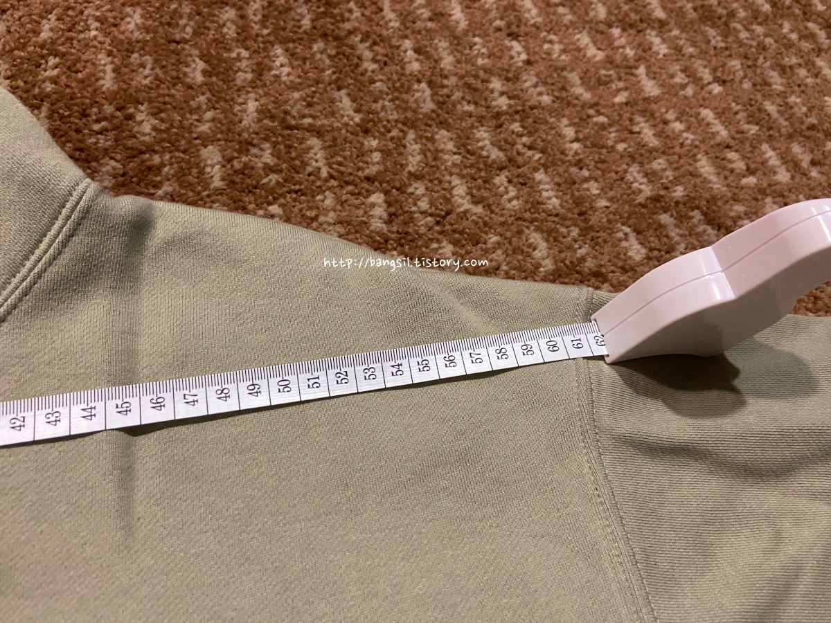 근데 의외로 팔길이는 그렇게 차이가 나지 않았어요. 이 정도 차이입니다. 그리고 통도 그렇게 차이가 크지 않아요. 그래서 저는 어깨랑 기장은 얼추 맞는데 팔의 통이 좀 크다고 느껴졌던 것 같아요.