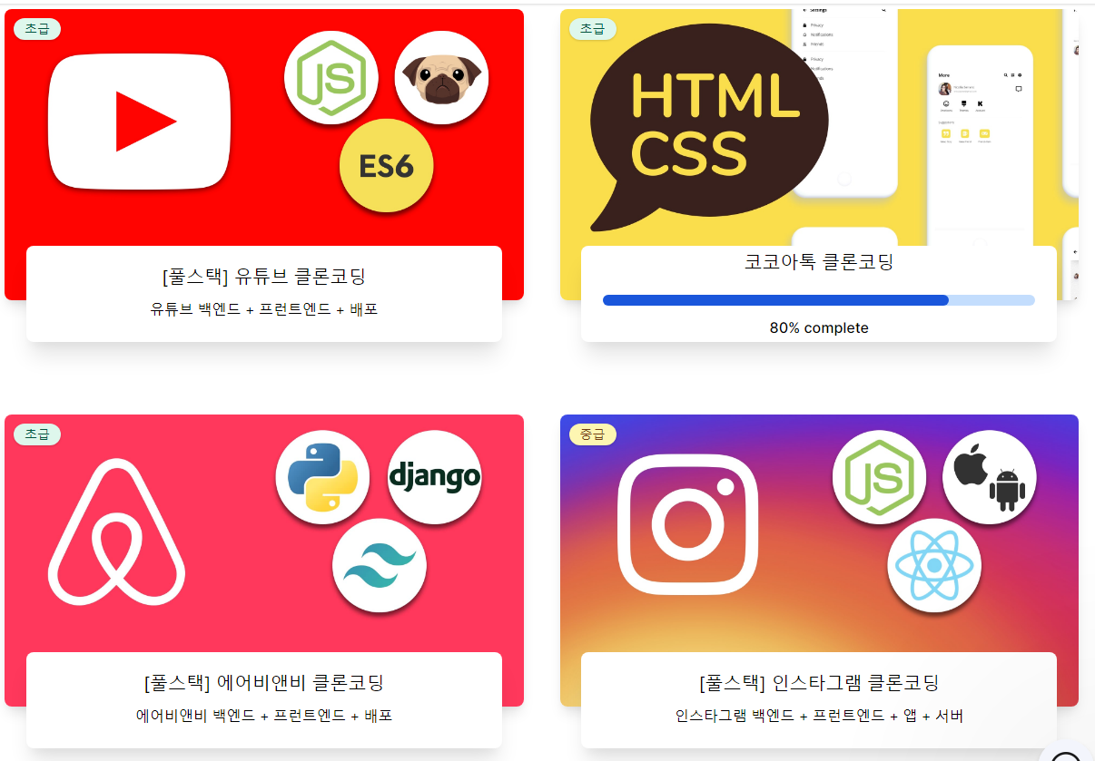 서론이 길었고, 노마드코더는 개발자 니콜라스가 직접 홈페이지를 만들면서 강의한다. 조금 더 세밀하게 말하자면 ‘클론코딩’을 한다. 즉, 유명한 웹사이트를 그대로 만들어본다!!! 일반인이 봤을 때 너무 끌리는 컨텐츠 아닌가? ‘카카오톡 클론코딩’ / ‘유튜브 클론코딩’ / ‘에어비앤비 클론코딩’ 등.. 정말 아니 이걸 내가 따라서 만든다고? 하는 사이트들이 가득하다.