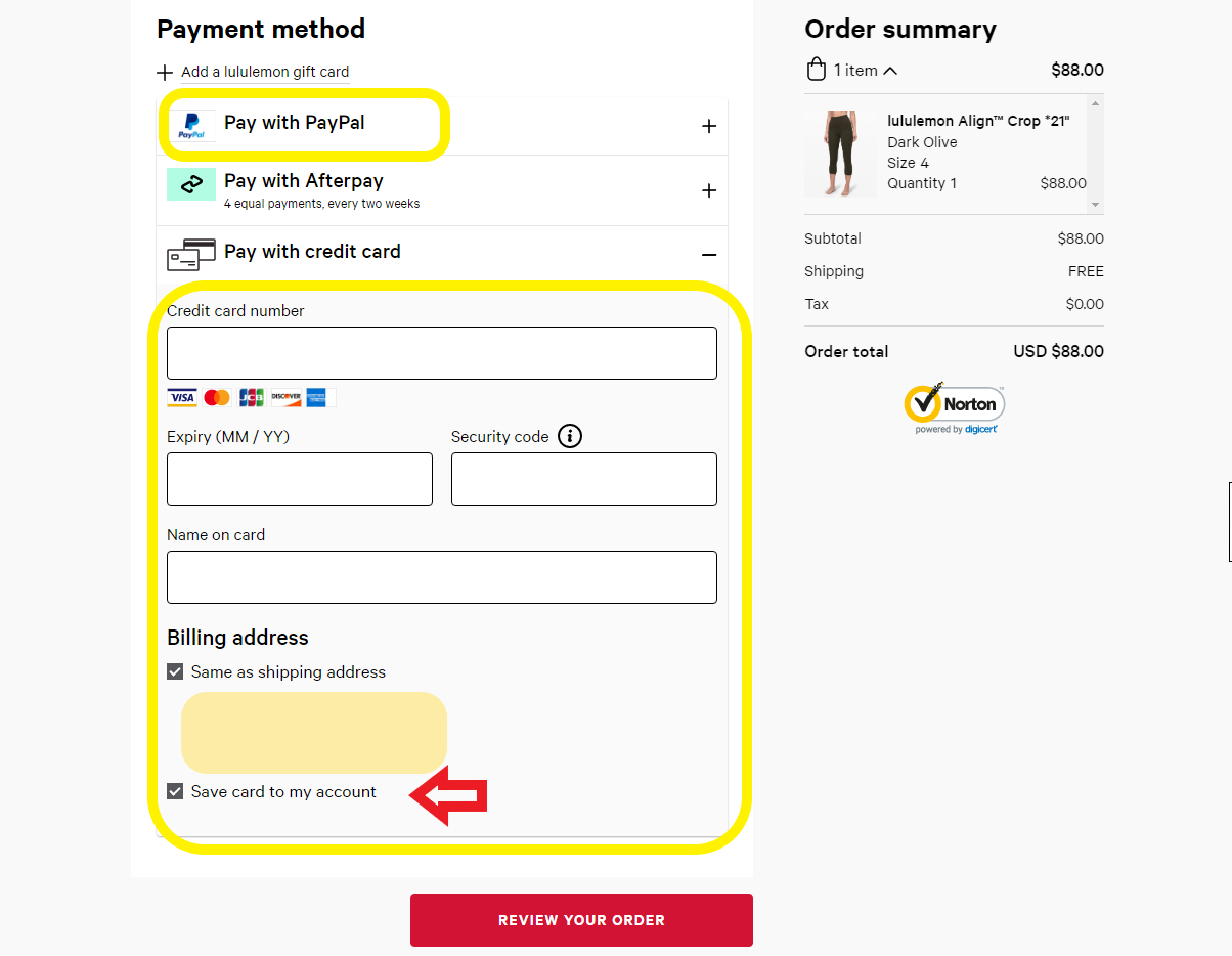 신용카드 입력의 경우 Save card to my account 를 확인한다. 체크하면 내 카드 정보를 저장해둬서 나중에 결제할 때 빨리 결제할 수 있지만, 내 신용카드를 저장해 놓는다는 찝찝함이 있습니다. 나는 잠복중일 때는 저장해놓지만, 대부분 신용카드를 쇼핑몰에 저장해 놓지 않습니다. 이제 마지막 단계로 넘어가기 위해서 Review Your Order 를 눌러서 내 주문내역을 다시 한번 확인합니다.