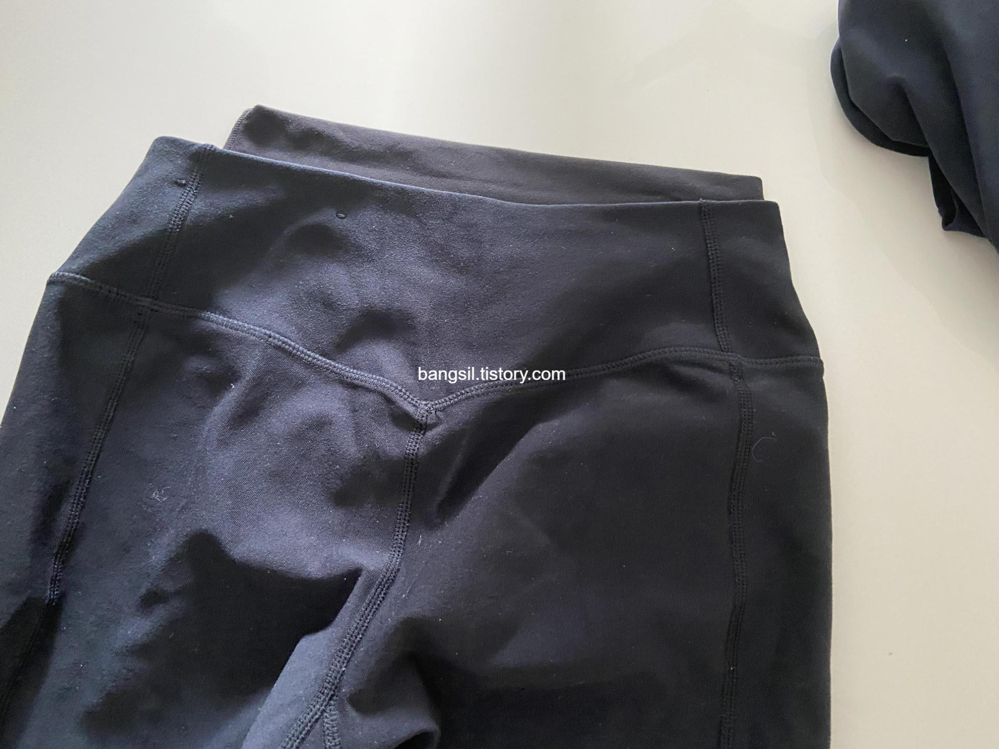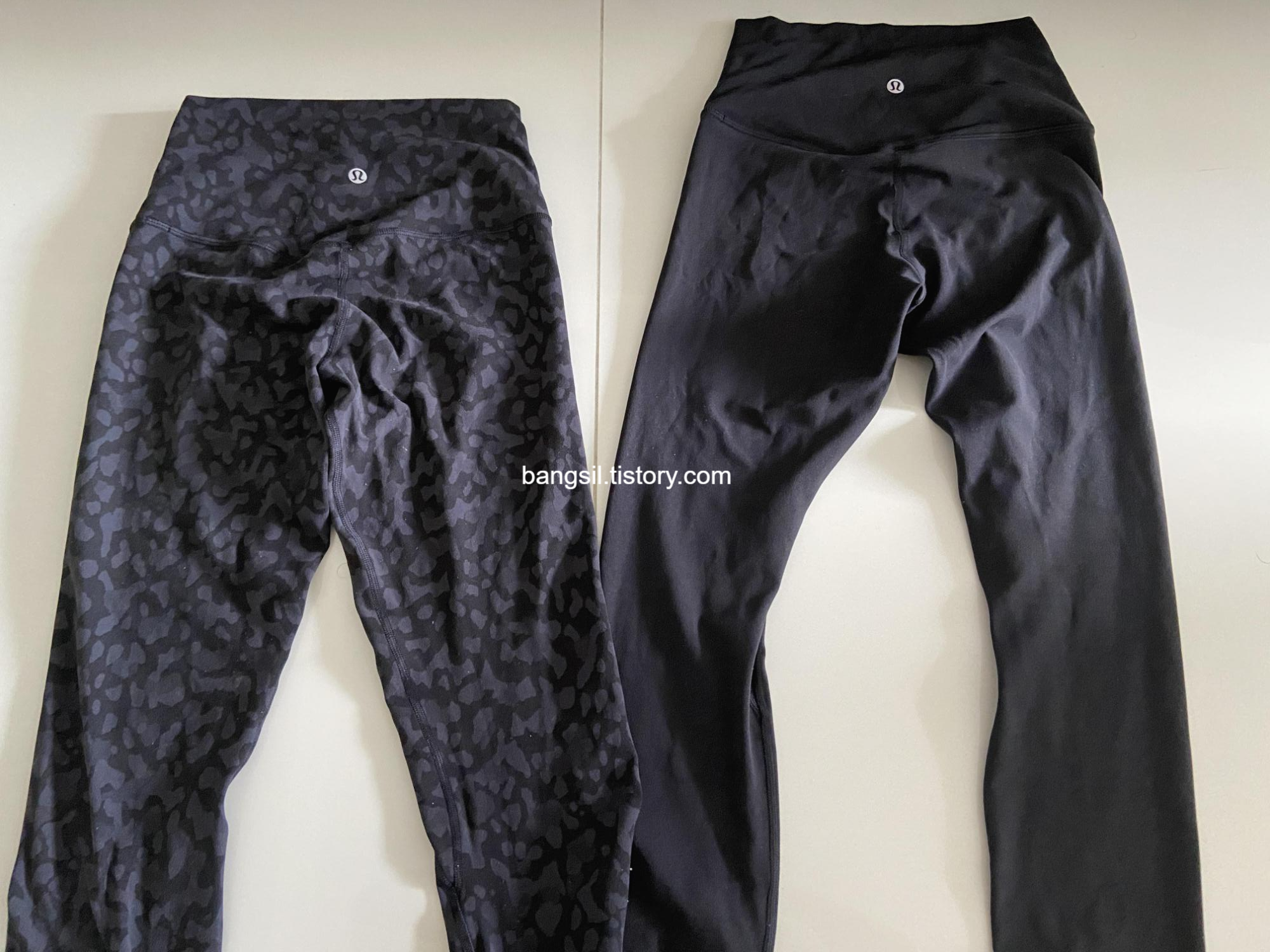 나이키 레깅스랑도 비교해 볼게요. 나이키 레깅스는 신축성이 거의 없어서 헬스장 갈 때 주로 입었었는데요. 위의 레깅스가 나이키 S사이즈, 아래가 룰루레몬 얼라인 4사이즈에요. 나이키가 허리가 더 커보이지만 신축성이 없고 미드라이즈라서 그냥 허리 단면이라고 보셔도 무방해요. 그래서 약간 하이라이즈인 룰루레몬이 허리가 더 작아보이긴 합니다.