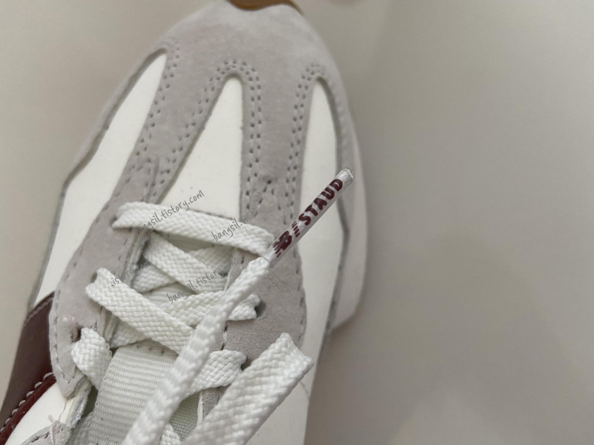 일반 뉴발란스 327 시리즈가 좀 안 내켰던 이유는 옆면 소재때문일거라고 생각합니다. 천으로 되서 약간 흐물흐물한 소재가 호불호가 있어요. 그런데 뉴발란스 스타우드 시리즈는 옆면 흰색 부분도 가죽이에요.