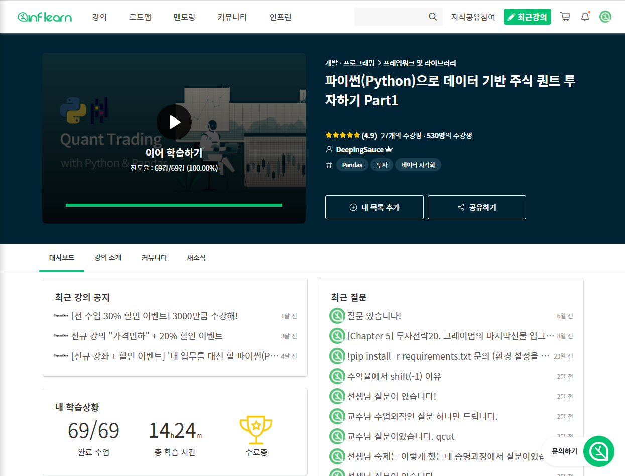 이 강의명은 "파이썬(Python)으로 데이터 기반 주식 퀀트 투자하기 Part1"인데, "인프런(Inflearn)"이라는 한국 사이트에 올라와 있다. 강사님은 "DeepingSauce"님이시다.