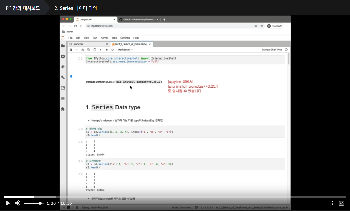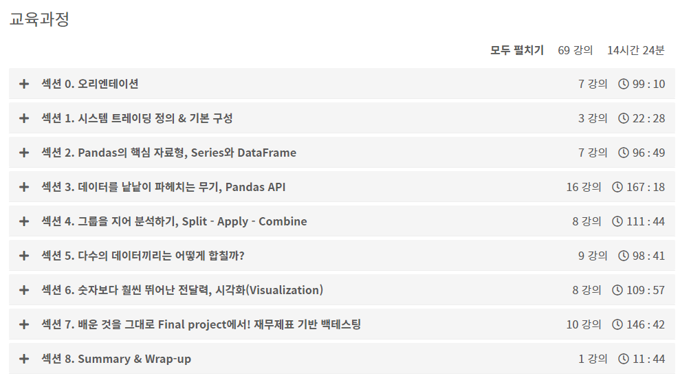 기본적으로 파이썬에서 주식 데이터를 다루는 법을 가르치고 있다. 파이썬 중에서도 데이터를 정제하고 다루는 Pandas에 대한 강의이다.